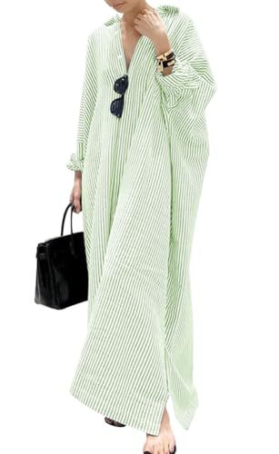 Women's Casual Long Sleeve Button Down Loose Striped Cotton Maxi Shirt Dress